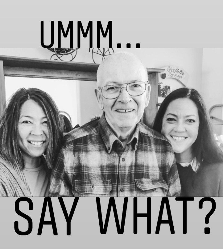 I figured that was approaching the excitement quota for the 15 hours I was in town. After the great COMPUTERCLEANUP OF 2019 was finished we tried to take some quick pictures. Let’s be real, I hate getting my picture taken, and my dad is even less of a fan. But every time I see him, the deterioration is more obvious, and he is literally dying in front of me, disappearing physically and mentally. I always think this might be the last picture, now. So, my sister said, “Squeeze in there close like you love her, Dad”. And he said, around a mouthful of M&Ms that he was eating as fast as my granddaughter, “I do love her.” I wiped the chocolate off his cheek, took the kimchee my mom packed up (and which I just now realized I forgot to tell my husband is in the outside fridge! Sorry, honey!) and hit the road. I was a mile down the freeway when I realized, that is the first time my dad ALMOST said he loved me. I know he DOES. I thought I was totally fine not hearing the words, because he didn’t grow up in a super affectionate, expressive family, and neither did I. I always say, “I love you” on the phone and he always says “Thanks” or “Here’s your mother” or something equally awkward. Maybe now he realizes every goodbye just might be our last goodbye, too. I hate dementia and the way it is killing him in slow motion. But it is giving me a chance to say goodbye slowly, too. To listen to the things that have been hard to say. To try and show love in a way that can be felt when a lot of the memories are going.