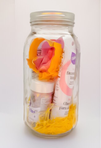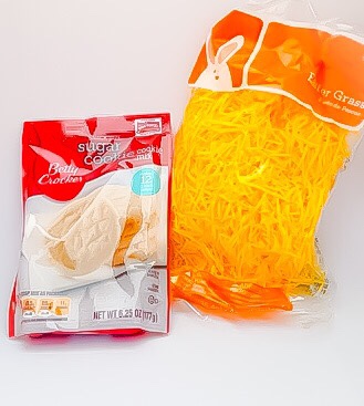 Add some Easter grass or paper shred. Then put in a sugar cookie mix. You need to stand it up and smoosh it against the side of the jar.