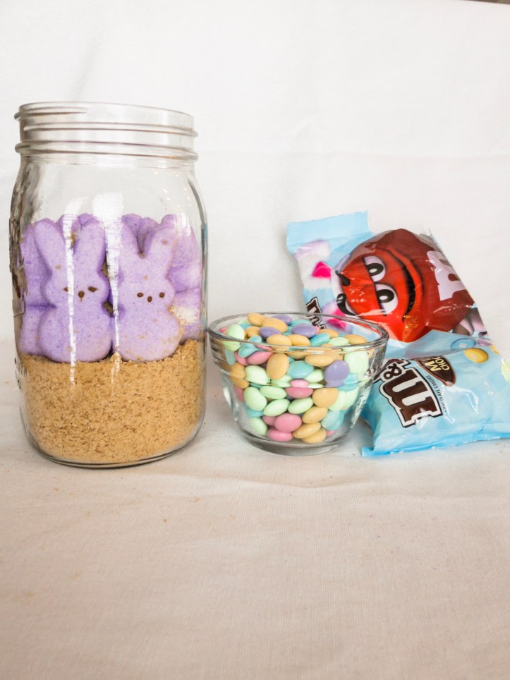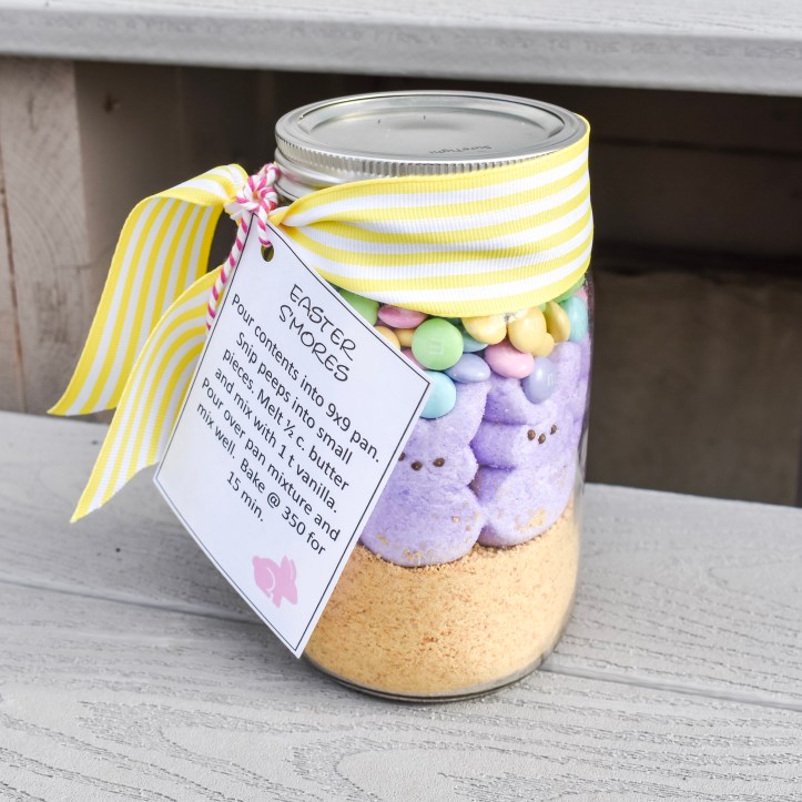 This is a super quick and cute idea for an Easter gift that is also a treat. S’mores In A Jar can be made for any season, really. As long as they sell Peeps for the occasion….