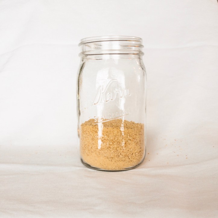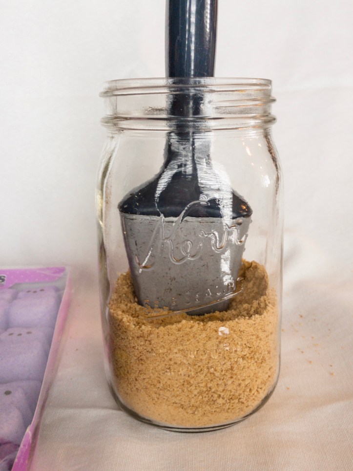 Pour 1 1/2 C graham cracker crumbs into jar.