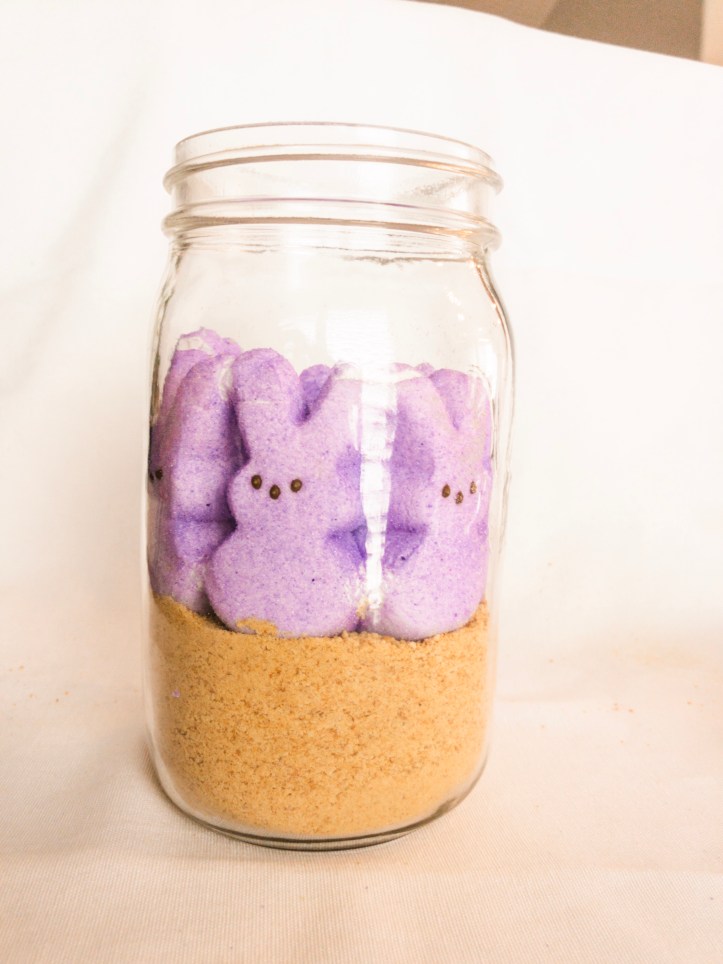 Add 1/3 cup brown sugar, packed. This is the only tricky part. Trying to get the brown sugar in the middle of the Peeps without some grains escaping and making their way to the front of the jar. If you are a perfectionist, use a funnel. If you’re a recovering perfectionist, accept that some sugar will get loose, and your bunnies might end up with freckles.
